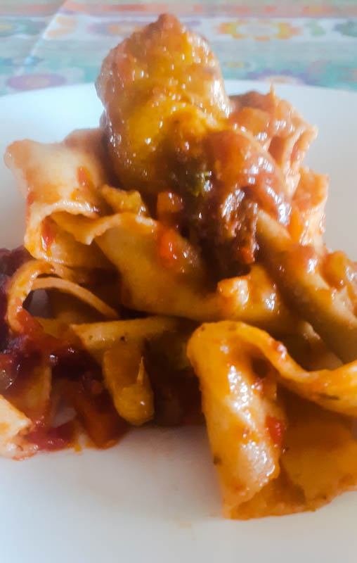 trascorso questo tempo, fate cuocere le pappardelle in abbondante acqua salata (giusta) quindi scolate le pappardelle direttamente nella padella del ragù, fate amalgamare per 1 minuto e servire nei piatti di portata.
